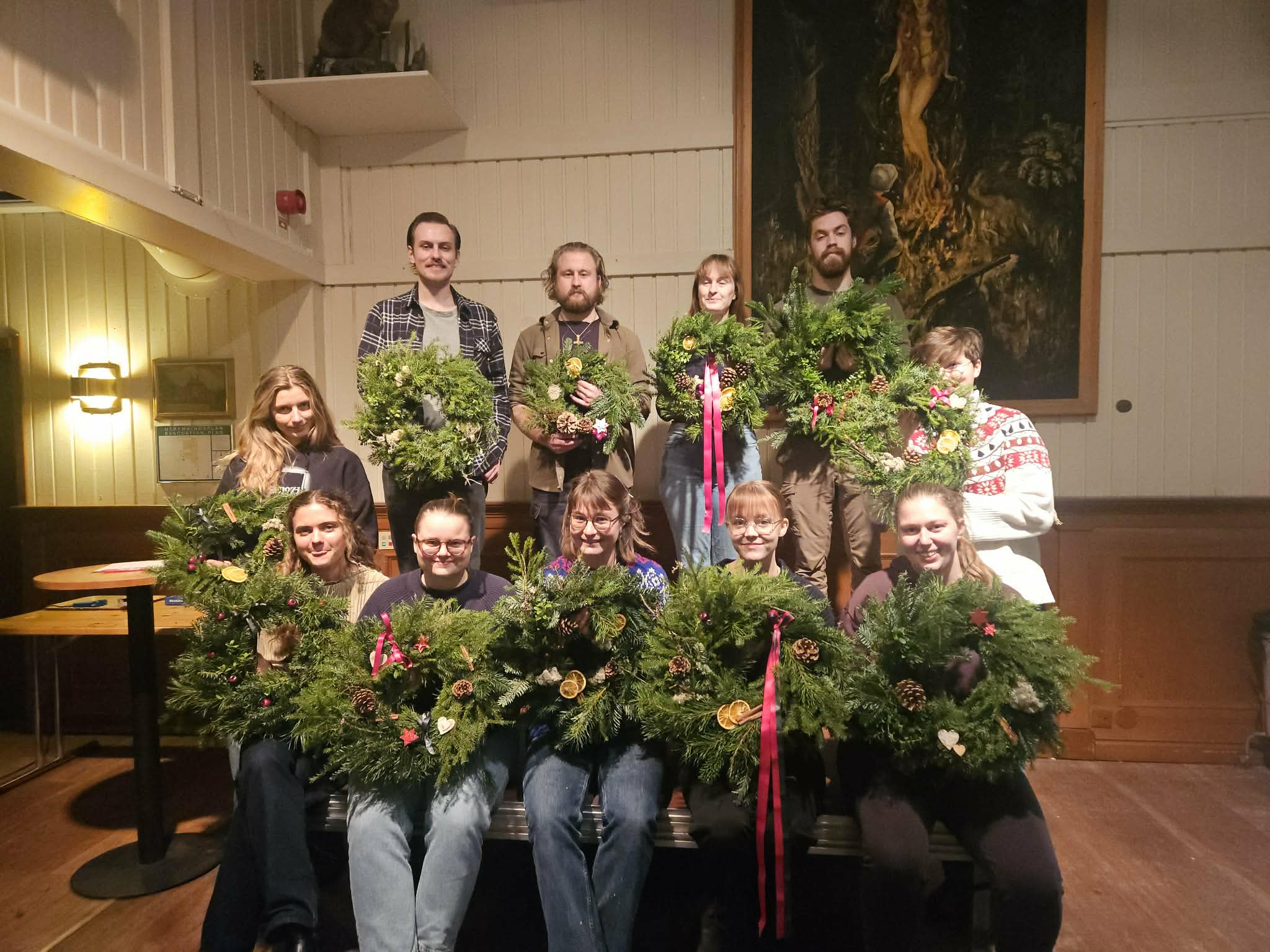 När grundkransen var klar fick alla dekorera efter eget tycke med bland annat grankottar, näverhjärtan, apelsinskivor, kanelstänger, röda bär och vackra sidenband. För att förstärka julstämningen dukades det även fram glögg, julmust, mjuk pepparkaka med frosting, ischoklad och clementiner.