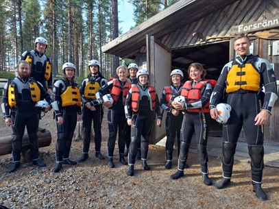 I och med att vi också skulle bo över hos Forsrännarna installerade vi oss i två stugor innan vi gick ner till ombytesboden. Där fick vi ta på oss våtdräkter, skor, flytvästar och hjälmar innan vi hoppade i en minibuss som tog oss sju kilometer uppströms. Efter en noggrann genomgång sjösatte vi båtarna och testade på olika kommandon som förhoppningsvis skulle hålla oss ovan vattenytan. När väl dånet från den första forsen nådde våra öron började adrenalinet pumpa och de nervösa flinen var många. Forsränningen blev sedan ett minne för livet.